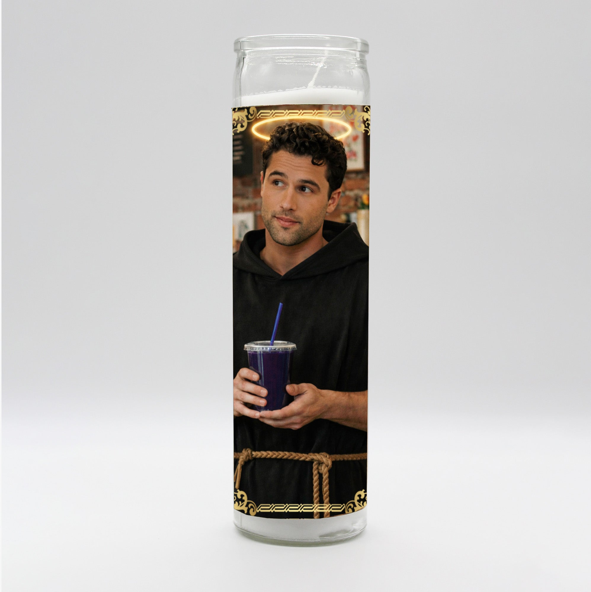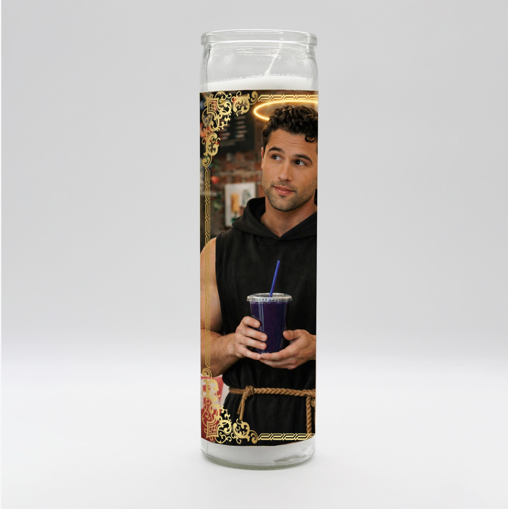 Tall white candle, hand poured in Mexico, design and assembled in the USA. Candle is unscented. Heated Rivalry Ilya Rozanov, Shane Hollander, Scott Hunter, and Kip Grady inspired parody art prayer candle. Set includes one of each candle.