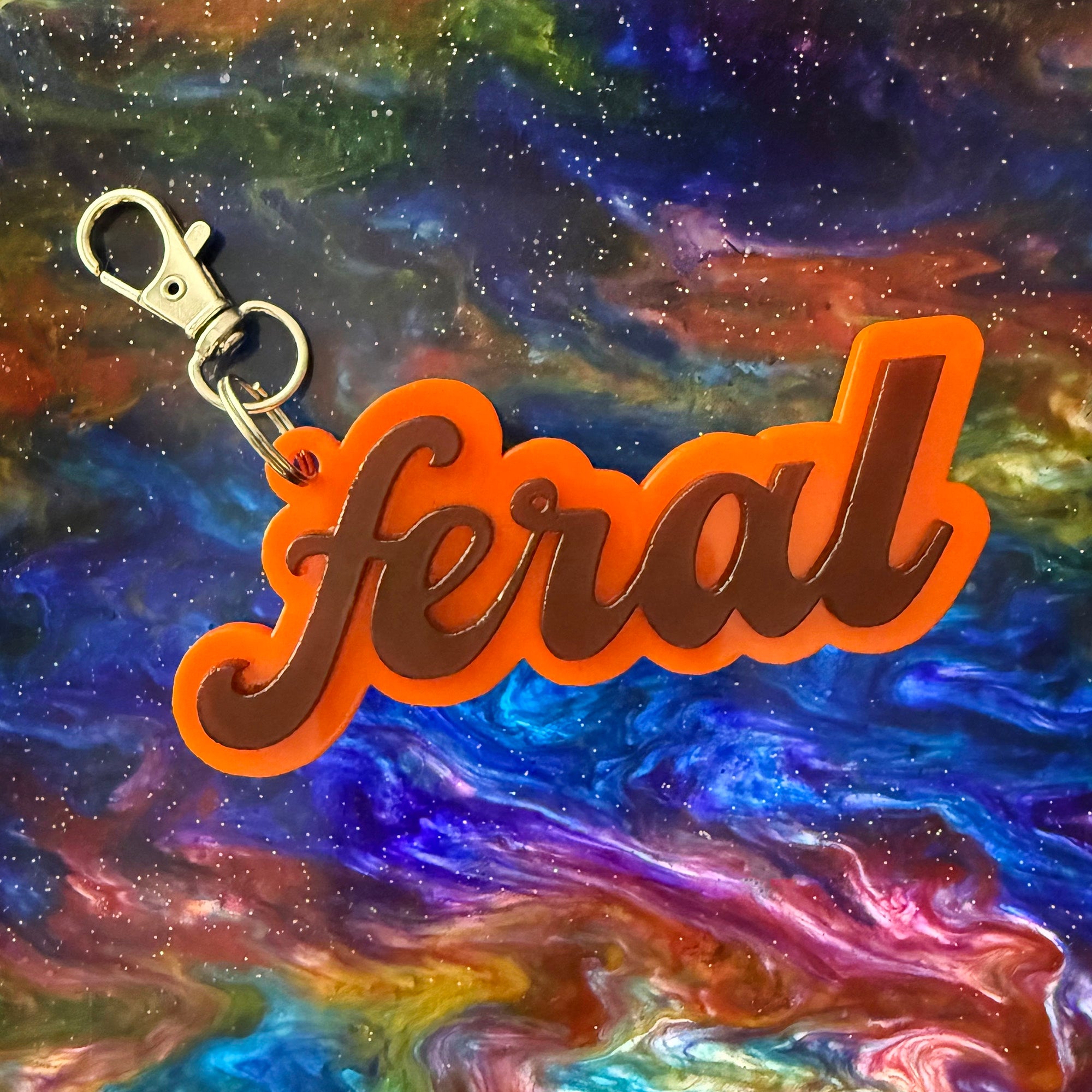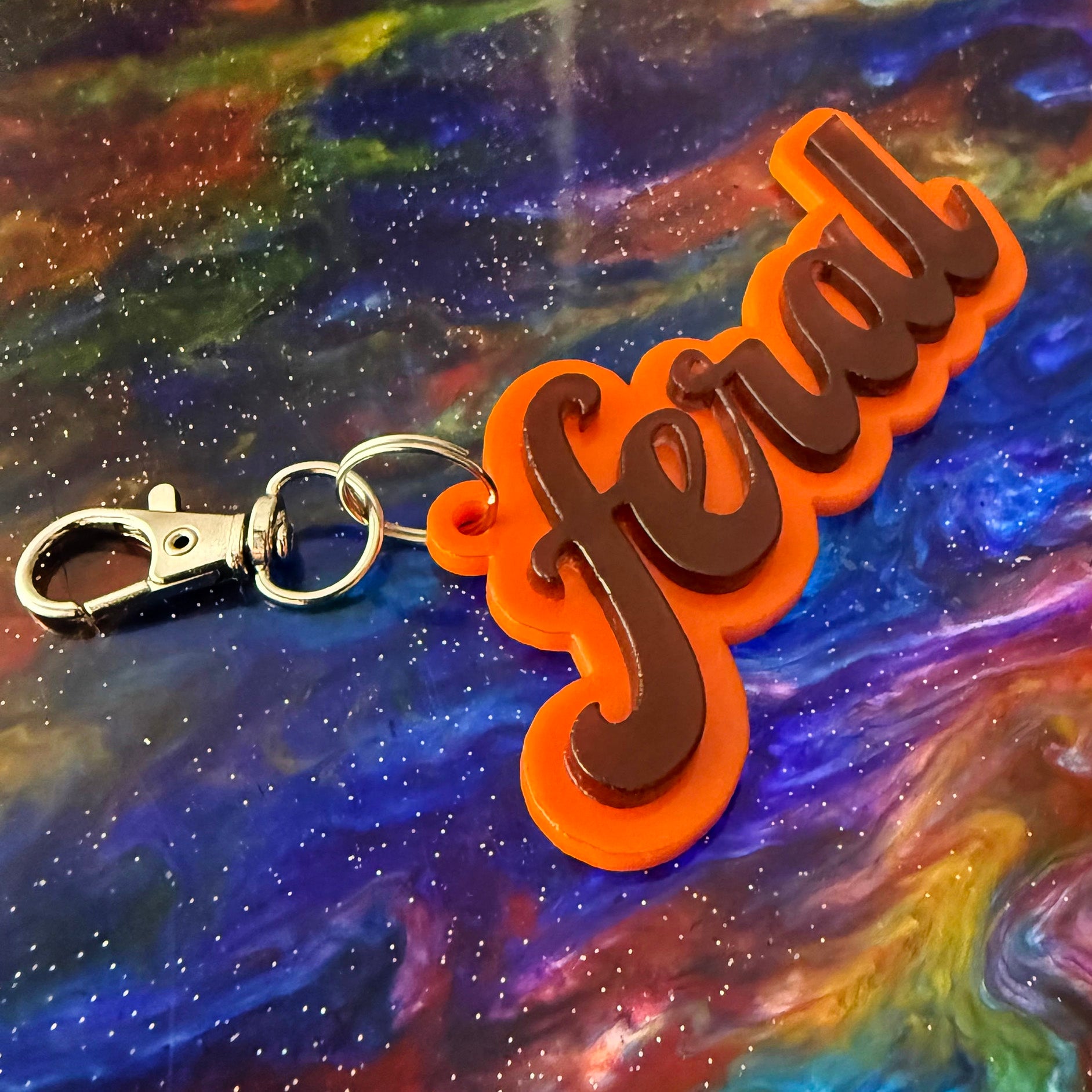 Machine cut, double layer orange / burgundy acrylic keychain made in the USA. Each top layer has a mineral finish that is unique to each keychain.