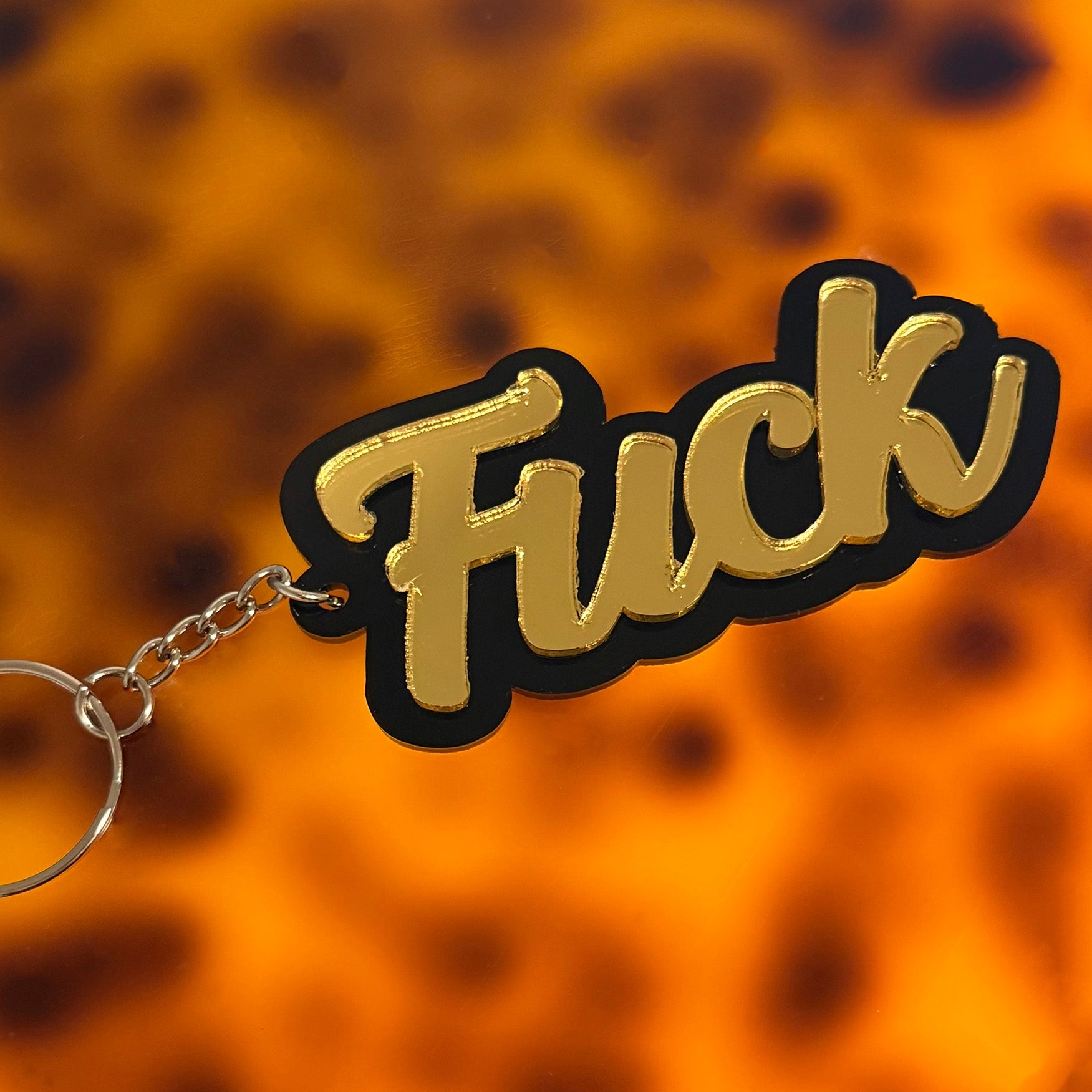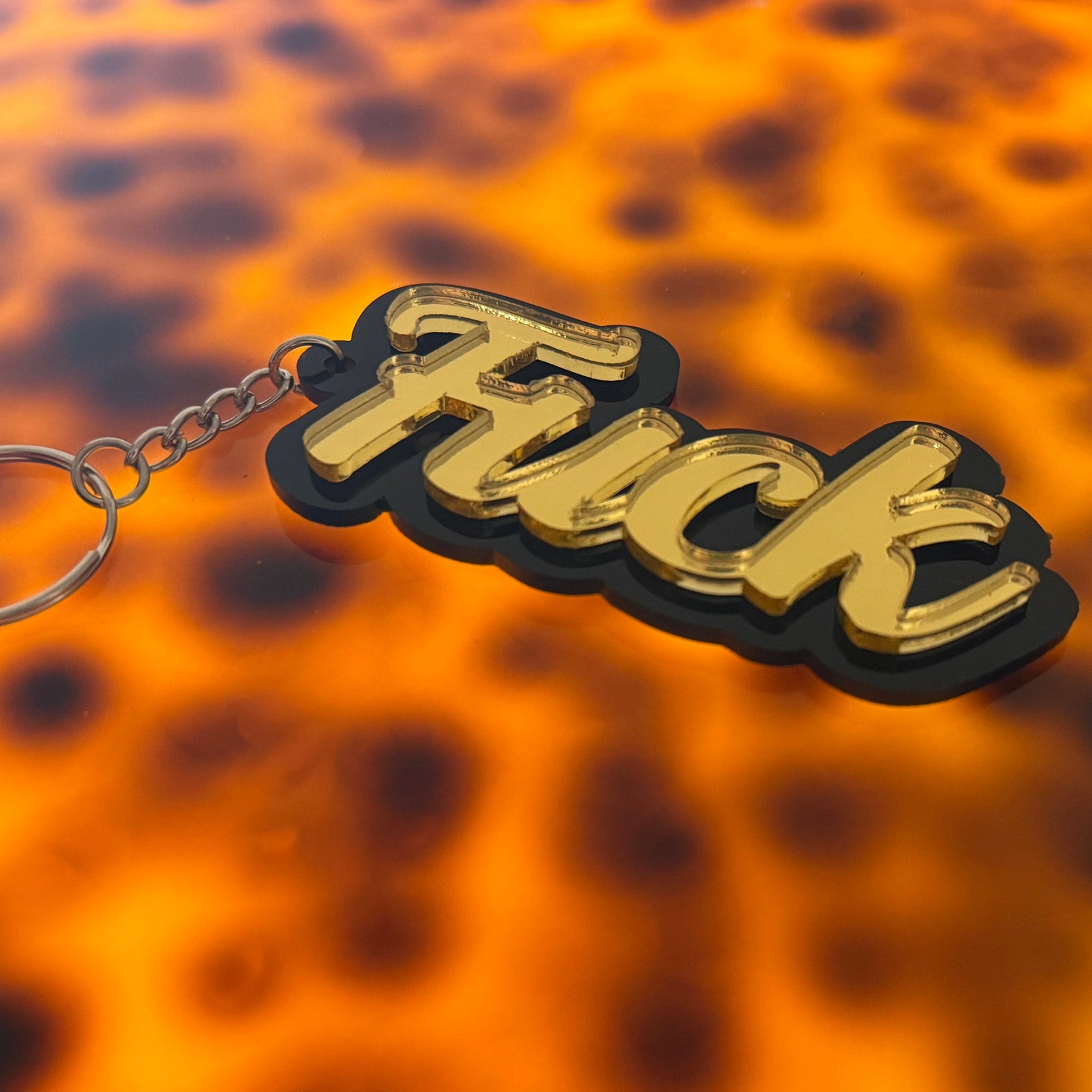 Machine cut, double layer gold mirror / black acrylic keychain made in the USA.