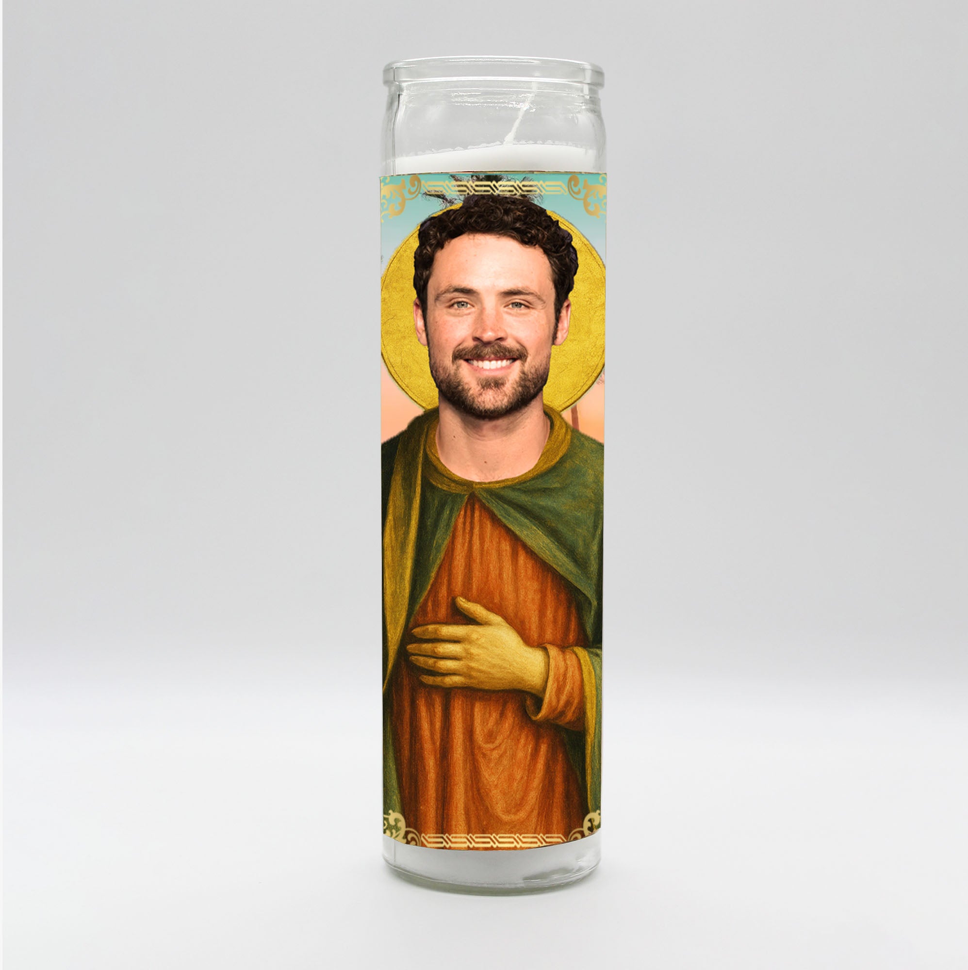Tall white candle, hand poured in Mexico, design and assembled in the USA. Candle is unscented. Dylan Efron inspired parody art prayer candle.