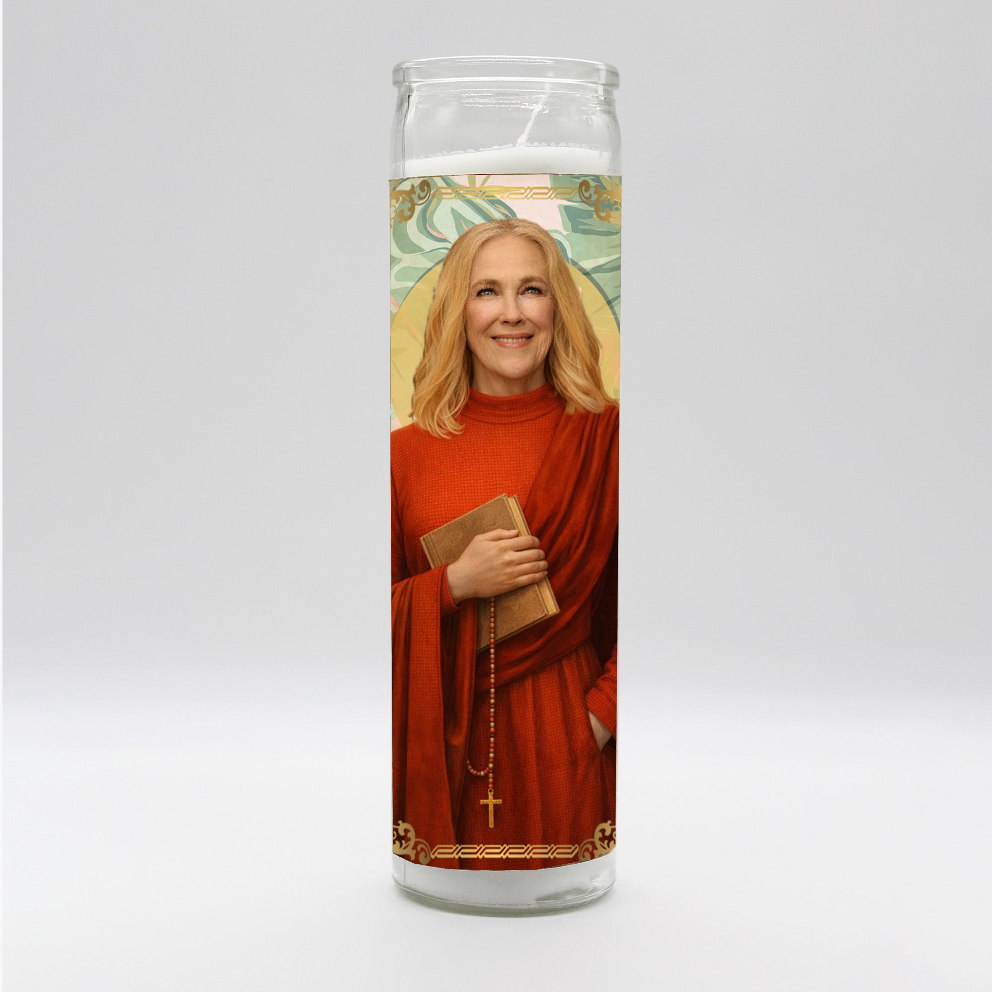 Tall white candle, hand poured in Mexico, design and assembled in the USA. Candle is unscented. Catherine O'Hara inspired parody art prayer candle.