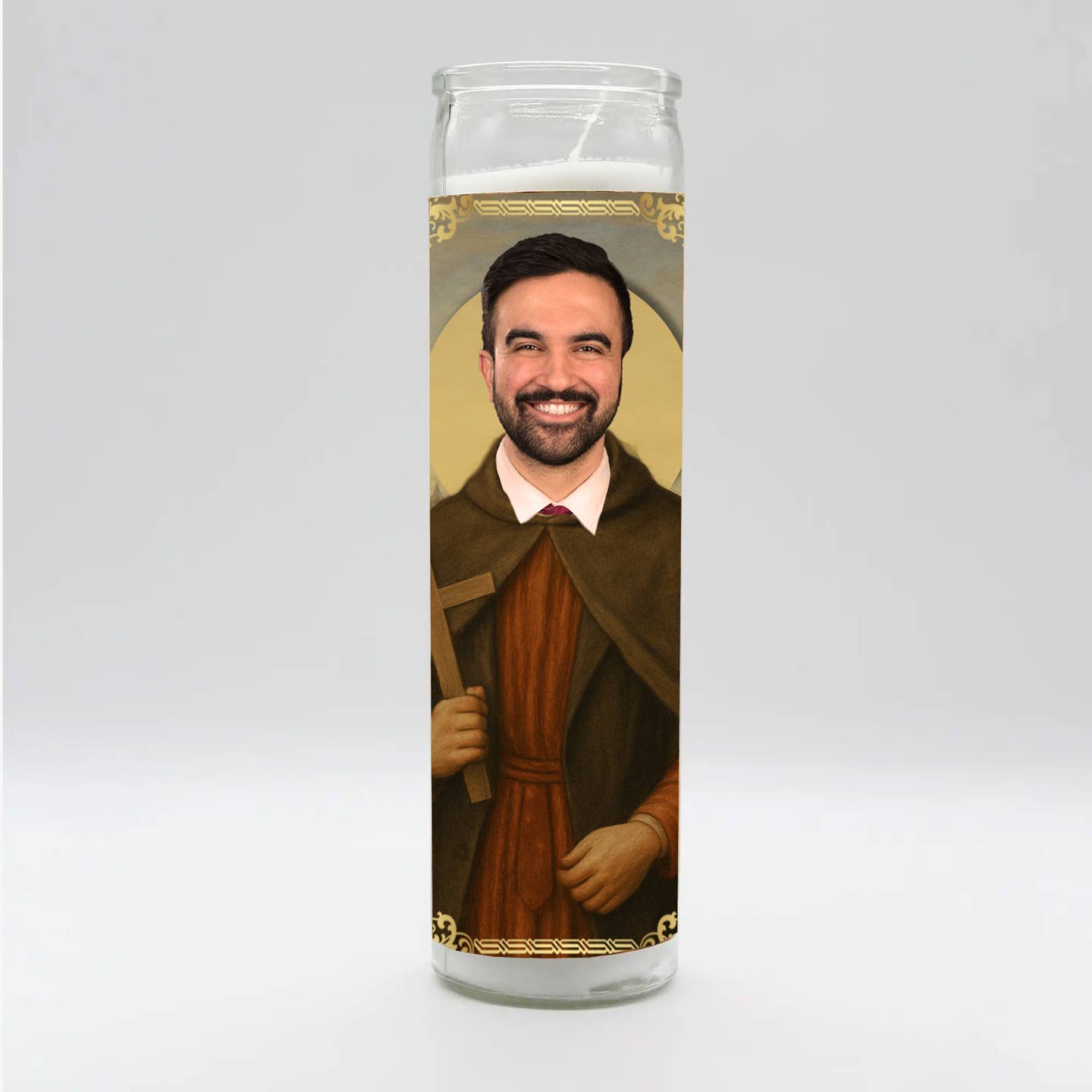 Tall white candle, hand poured in Mexico, design and assembled in the USA. Candle is unscented. Zohran Mamdani inspired parody art prayer candle.