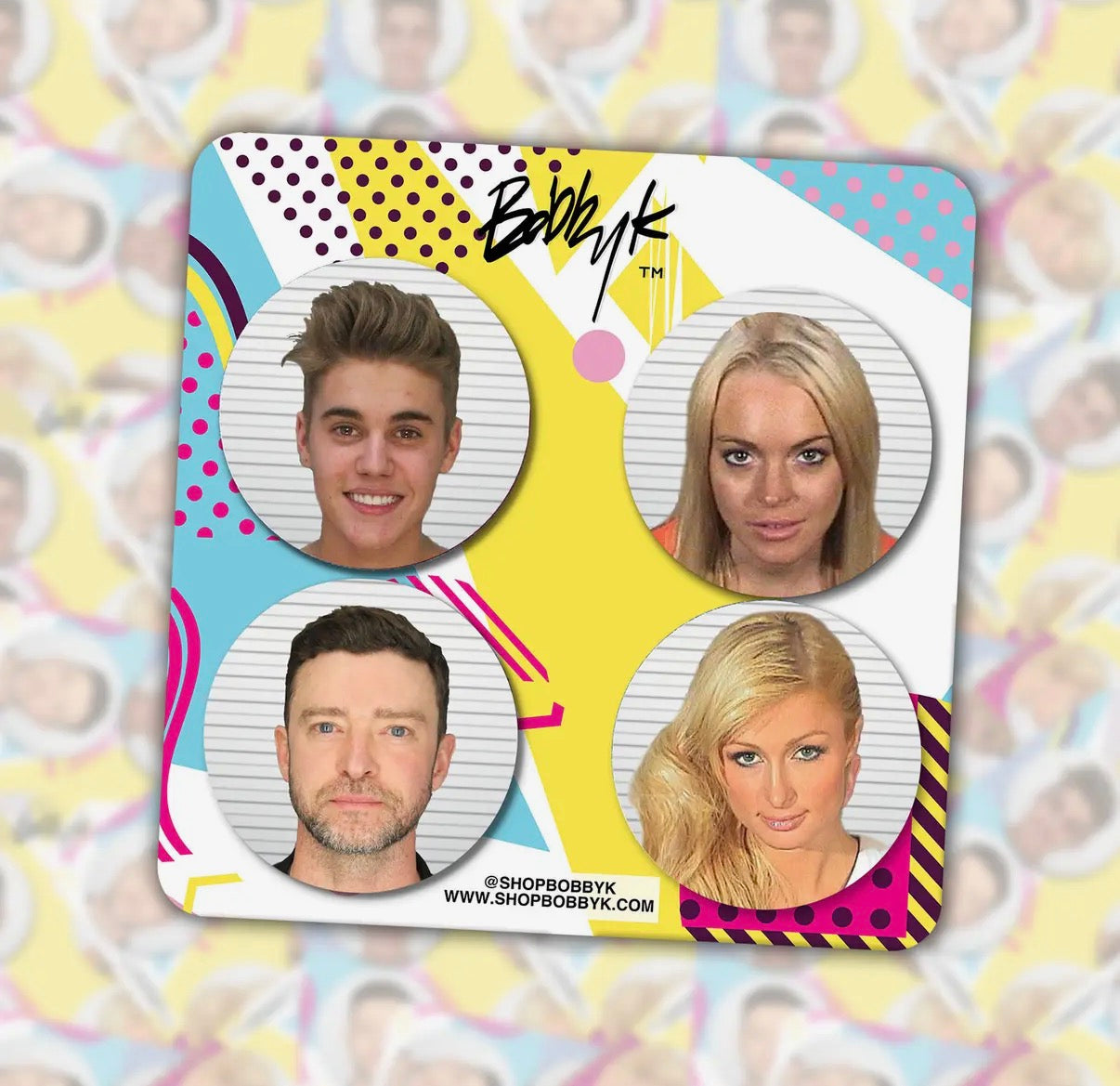 Button cards include one of each button with a parody art design of celebrity mugshots: